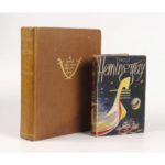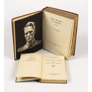 LAWRENCE (T. E.). Seven pillars of wisdom. A triumph. Londres, Jonathan Cape, (1935). Fort in-4, 672 pp., bradel toile brune de l'éditeur. Première édition anglaise mise dans le commerce, illustrée de 55 illustrations in et hors texte dont de nombreux portraits, et 4 cartes dépliantes. Ex-libris manuscrit : L. C. Nutt, Meriden, N. Coventry. Taches sur la reliure et au dos, lég. passé. Joint : HEMINGWAY (Ernest). Across the river and into the trees. Londres, J. Cape, (1950). In-12, bradel toile verte, jaquette illustrée en couleurs. Véritable édition originale anglaise, qui précède de quelques jours l'originale américaine, avec la mention "First Published 1950" au verso du titre ; et premier tirage de la jaquette illustrée, avec le prix "9s.6d. net". Piqûres sur les gardes et la toile verte. Petites déchirures et taches à la jaquette, avec manques en tête et en pied du dos.