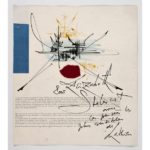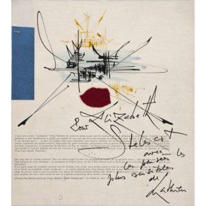 MATHIEU (Georges) (1921-2012) Sans titre. Aquarelle, encres de couleur et collage de feutrine rouge sur une page de catalogue Dédicacé "Pour Elisabeth" et signé 31 x 27,5 CM