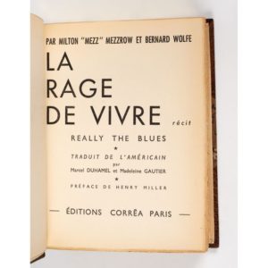 MEZROW (Milton "Mezz") et Bernard WOLFE. La Rage de vivre. Récit. Really the blues. Paris, Corrêa, 1950. Fort in-8, demi-maroquin brun à coins, dos à nerfs, tête dorée, non rogné, couv. et dos cons. (Rel. moderne). Édition originale française, traduite de l'américain par Marcel Duhamel et Madeleine Gautier, et ouvrant sur une préface de Henry Miller. Cette autobiographie de Mezz, clarinettiste de jazz américain, parut d'abord aux USA en 1946. Un des 25 exemplaires de tête sur vélin Marais.