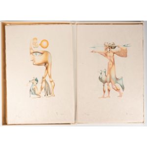 PERAHIM. L'Alphabet. Paris, Galerie Mony Calatchi, 1974. In-folio (570 x 385 mm) en feuilles, étui éditeur, carton de conservation. Portfolio de 22 lithographies originales de Perahim, signées et numérotées. Avec un texte de Mme Marina Vanci qui présente les recherches de Perahim se fondant à la fois sur les 22 arcanes du tarot et les 22 lettres de l'alphabet hébreu. Tirage à 250 exemplaires. Un des 25 exemplaires de tête sur Japon, n° IV.