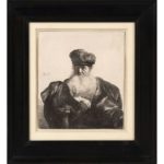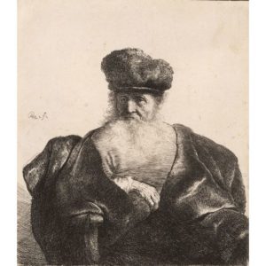 REMBRANDT VAN RIJN (1606-1669) Vieil homme barbu à la toque en fourrure et au manteau de velours Eau-forte et burin Très belle épreuve avec barbes de pointe sèche, coupée à la lisière du cuivre Trait de plume à l'encre noire tout autour de la planche, légères amincissures et infime pli vertical Epreuve du 2ème état Cachet d'une ancienne collection peu lisible au verso, peut être Robelot ? (Lugt 2141 ?) Etching and chisel Very nice proof with dry point beards, cut at the edge of the copper. Pen stroke in black ink all around the plate, slight thinnings and tiny vertical fold. 2nd state test Stamp from an old collection, difficult to read on the back, perhaps Robelot? (Lugt 2141?) 14,9 x 13 CM - 5 7/8 x 5 1/8 IN Bibliographie : Boon 262, New Hollstein 92 II/III