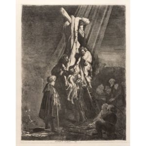REMBRANDT VAN RIJN (1606-1669) GRANDE DESCENTE DE CROIX Eau-forte, burin Belle épreuve en tirage XIXe sur chine appliqué sur un papier fort, avec l'adresse de l'éditeur Lamoureux, rue St Jean de Beauvais en bas à droite sous le sujet Nombreuses rousseurs au verso, petites marges Etching, chisel Beautiful proof in a 19th century print on chine applied to strong paper, with the address of the publisher Lamoureux, rue St Jean de Beauvais at the bottom right under the subject Numerous foxings on the back, small margins 53 x 46 CM - 20 7/8 x 18 1/8 IN Bibliographie : Boon 81, New Hollstein 119, VII/VIII