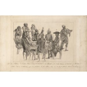 Jean HUBER (1721-1786) Voltaire présidant le repas des Philosophes, vers 1780-1790 Eau-forte sur vélin Les convives présents autour de la table sont numérotés et légendés à l'encre brune dans la marge Quelques déchirures et petits manques dans les marges, légères traces de plis et amincissures Etching on vellum The guests present around the table are numbered and captioned in brown ink in the margin Some tears and small gaps in the margins, slight traces of folds and thinning Sujet : 21,3 x 31,2 CM ; Feuillet : 30 x 45 CM - Subject: 8 3/8 x 12 1/4 IN ; Sheet: 11 3/4 x 17 3/4 IN