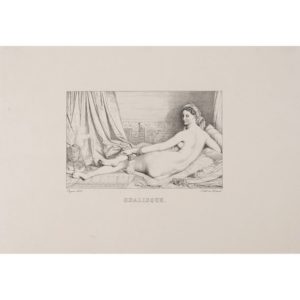 Jean-Auguste-Dominique INGRES (1780-1867), D'après Odalisque, 1825 Lithographie sur vélin Notée "Ingres" et datée "1825" en bas à gauche dans la planche Petits trous de brochage dans le bord gauche, légères amincissures, infime manque, nettoyée Lithograph Annotated “Ingres” and dated “1825” lower left in the plate Small pinholes in the left edge, slight thinning, tiny missing, cleaned Sujet : 13 x 20,9 CM ; Feuillet : 28,3 x 41 CM - Subject: 5 1/8 x 8 1/4 IN ; Sheet: 11 1/8 x 16 1/8 IN Bibliographie : Delteil 9