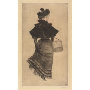 Henri PILLE (1844-1897) élégante à la mode, vers 1900 Eau-forte et pointe sèche Monogramme de l'artiste en couleurs sur la planche en bas à droite, une signature au crayon dans la marge Légèrement jaunie, quelques amincissures dans les marges. Etching, drypoint Artist's monogram in colors on the plate at the bottom right, a pencil signature in the margin Slightly yellowed, some thinning in the margins. Sujet : 50,8 x 29,7 CM ; Feuillet : 58,8 x 35,5 CM - Subject: 20 x 11 3/4 IN ; Sheet: 23 1/8 x 14 IN