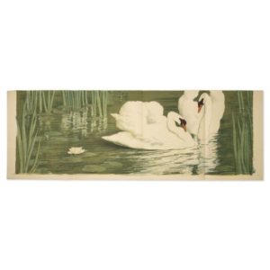 ALFREDO MULLER (1869-1939) CYGNES, 1903 Lithographie en couleurs Feuillet plié en quatre Pliures, petit accroc dans la pliure verticale médiane Coloured lithograph Folds, small tear in the middle vertical fold Sheet folded in four Feuillet : 56 x 159,5 CM - Sheet: 22 x 62 3/4 IN
