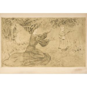 ALFREDO MULLER (1869-1939) ENFANT JOUANT A LA BALLE Eau-forte et aquatinte, en ton vert Trace de signature, restauration avec reprise, quelques traces de plis Petites marges Etching and aquatint, in green tone Trace of signature, restoration with recovery, some traces of folds Small margin Sujet : 29,5 x 49 CM ; Feuillet : 36 x 51 CM - Subject: 11 5/8 x 19 1/4 IN ; Sheet: 14 1/8 x 20 1/8 IN