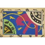HENRI MATISSE (1869-1954), D'après LA DANSE Au verso, deux sujets d'après des papiers découpés Lithographies en couleurs publiées dans la Revue Verve On joint : Le Cheval, l'écuyère et le clown Double page d'une plaquette annonçant le livre "Jazz" Jaunie avec des frottements, déchirures, petits manques et plis dans le bord, pliure médiane LA DANCE On the back, two subjects from paper cutouts Color lithographs published in Revue Verve We attach: The Horse, the Rider and the Clown Double page of a brochure announcing the book “Jazz” Yellowed with rubbing, tears, small gaps and folds in the edges, central fold Set of 2 boards. 33 x 39 CM ; 30 x 47 CM - 13 x 15 3/8 IN ; 11 3/4 x 18 1/2 IN