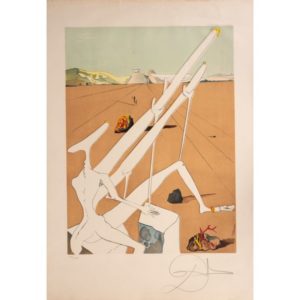 SALVADOR DALI (1904-1989) Martien muni d'un double microscope Planche de la Conquête du cosmos Eau-forte, pointe sèche, chromolithographie en couleurs Signée et numérotée 126/195 Etching, drypoint, coloured chromolithograph Signed and numbered 126/195 Sujet : 75 x 55,5 CM ; Feuillet : 100 x 70 CM - Subject: 29 1/2 x 21 7/8 IN ; Sheet: 39 3/8 x 27 1/2 IN Bibliographie : Michler et Löpsinger 644