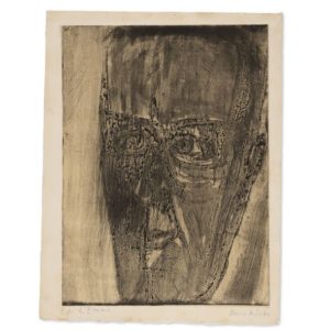MARIA ELENA VIEIRA DA SILVA (1908-1992) Portrait de René Char Planche de l'ouvrage "Sept portraits" Aquatinte sur Japon pelure appliquée sur papier velin Signée et justifiée "Epreuve d'essai" sur la feuille Le support se décollant partiellement, quelques plis et cassures, taches au verso Aquatint on Japan peel applied Signed and justified “Test proof” on the sheet The support is partially peeling off, some folds and breaks, stains on the back 29 x 21 CM - 11 3/8 x 8 1/4 IN Bibliographie : Rivière 141