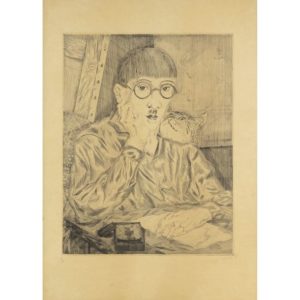 TSUGUHARU FOUJITA (1886-1968) Autoportrait au chat (avec profil de femme), 1927 Pointe sèche sur papier Numérotée 12/100, signée en français et en japonais, éditée par la Chalcographie du Louvre Légers plis dans les bords, infimes taches, quelques cassures en haut à gauche, bord inférieur jauni Drypoint on paper Numbered 12/100, signed in French and Japanese, published by Chalcographie du Louvre Slight creases at the edges, tiny stains, some breaks at the top left, yellowed lower edge Sujet : 44 x 34 CM ; Feuillet : 62 x 48 CM - Image: 17 3/8 x 13 3/8 IN ; Sheet: 24 3/8 x 18 7/8 IN Bibliographie : S. Buisson TII, 27.90