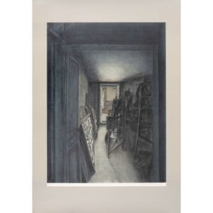 SAM SZAFRAN (1934-2019) L'ATELIER DE RAYMON MASON Lithographie en couleurs sur papier Signée et numérotée 56/75 Une pliure dans le bas, en dessous du sujet Coloured lithograph on paper, signed and numbered 56/75, a fold under the subject Sujet : 78 X 57,5 CM ; Feuillet : 104,4 x 73 CM - Image : 30 3/4 x 22 5/8 IN. ; sheet : 41 1/8 x 28 3/4 IN.