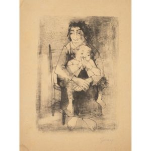 JEAN JANSEM (1920-2013) MERE ET ENFANT Lithographie sur papier beige Signée Petites mouillures dans les angles Lithograph on beige paper Signed Small wet spots in the corners 36 x 24,5 CM - 14 1/8 x 9 5/8 IN