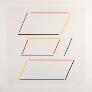 GENEVIEVE CLAISSE (1935-2018) Compositions parallépipède 4 couleurs Sérigraphie en couleurs Signée en bas à droite et justifiée ARCHIV Cachet sec éditeur Galerie F Screenprint, signed lower right and annotated ARCHIV Dry publisher's stamp Gallery F 60,5 x 60,5 CM - 23 7/8 x 23 7/8 IN