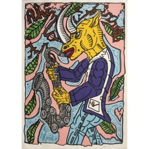 Robert COMBAS (né en 1957) RHINO, 2020 Sérigraphie en couleurs sur vélin Signée et numérotée 100/100 Editée à l'occasion de la 42ème édition du Rhinojazz(s) de Saint Etienne en 2020 d'après la peinture "Rhino" qui a servi à l'affiche du festival Papier gondolé, trace d'humidité au verso, petites pliures sur les bords Screenprint, signed and numbered 100/100 Published on the occasion of the 42nd edition of Rhinojazz(s) in Saint Etienne in 2020 based on the painting "Rhino" which was used on the festival poster Curled paper, trace of humidity on the back, small folds on the edge 69,5 x 49,5 CM - 27 3/8 x 19 1/2 IN
