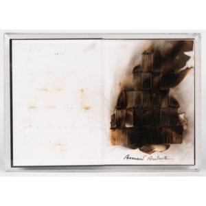 Bernard AUBERTIN (1934-2015) Il Fuoco e Il Rosso Dai tableaux clous ai tableaux brutalisés. Editions Galleria d'Arte, 2010 Livre signé au feutre sur la page de droite avec une œuvre en allumettes brûlées Encadré sous plexiglass Un angle du cadre fissuré Book signed in felt-tip pen on the right page with miwed media in burnt matches Framed under plexiglass A corner of the cracked frame 29,5 x 43,5 CM environ - Dimensions: approximately 11 5/8 x 17 1/8 IN
