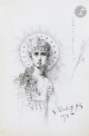 lettres dorées sur le plat sup., tranches dorées. Dessins par Bertall (jeune femme penchée sur un nid d'amours), Léon Bonnat (ange enlevant un martyr), Michel Bouquet (marine), Carolus Duran (l'assassin Bistor et Anna Perrin en Cour d'assises, 12 mai 1882), Guillaume Dubufe (Santa Cecilia), Edmond Dupain (2 : le Girondin Buzot dévoré par un loup, et " Sur les rochers "), Alexandre Falguière (Salomé), Hector Giacomelli (aquarelle : oiseaux), Louise Heger (paysage), Louis-Eugène Lambert (aquarelle : chat), Madeleine Lemaire (aquarelle : roses), Louis Olivié (sanguine : bébés), Giuseppe Palizzi (âne dans une basse-cour), Henri Schlesinger (Bretonnes au bord de la mer), Alfred Stevens (" La Parisienne mélange d'anémie et d'exaltation "), J. Westwood (château au bord de la mer), etc. Musiques par Gaetano Braga (Serenata polacca), Charles Gounod (Amen avec une pensée), Ernest Guiraud (air de Piccolino), Jules Massenet (" Divertissement des esclaves Persans ", Roi de Lahore, acte 2). Poèmes par Émile Augier, Louise Ackermann, Théodore de Banville (Le Vallon), Henri de Bornier, Michel Bouquet, François Coppée, Cuvillier-Fleury, Paul Déroulède, Émile Deschanel, Camille Doucet, Eugène Manuel, Xavier Marmier (La source, traduit du suédois), Eugène Muller, Jean Richepin (Ballade pour les pauvres petits Pierrots), Georges Rodenbach (Le coffret), Edmond Rousse, André Theuriet, Gaston Tissandier, René Vallery-Radot, J. Westwood... Pensées et proses par Édouard Allou, Jules Barbey d'Aurevilly (" Aux yeux inconnus ! "), Paul Casimir-Périer, Jules Claretie, Alexandre Dumas fils, Octave Feuillet, Adophe Franck, Edmond Gondinet, Guillaume Guizot, Édouard Laboulaye, Ernest Legouvé, Jules Levallois, Adolphe Mézières, Désiré Nisard, Camille Perier, Jules Sandeau, un " ambassadeur du Foutah Djallon "...