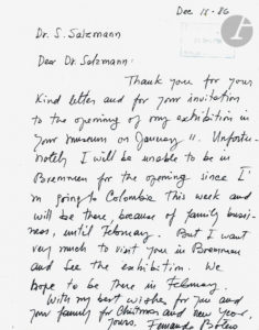 Fernando BOTERO (1932-2023). L.A.S., 15 décembre 1986, au Dr. Salzmann ; 1 page in-4 ; en anglais. Il regrette de ne pouvoir accepter son invitation à l'occasion du vernissage de son exposition à Bremen, devant être à cette date en Colombie pour...