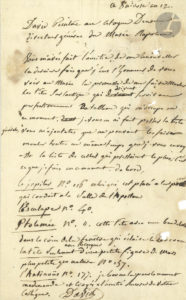proposé de " faire monter les têtes sur l'antique qui doivent servir au perfectionnement du tableau qui m'occupe en ce moment " ; toutes ne peuvent être montées en même temps. David donne ici la liste de " celles qui pressoient le plus " : " Le Jupiter n° 116 celui qui est placé à la porte qui conduit à la Salle de l'Apollon. L'Esculape n° 40. Ptolémée n° 0. Cette tête avec une bandelette dans le coin de la fenêtre qui éclaire le Laocoon. La tête seulement avec le casque d'une petite figure de Mars plus petite que nature n° 157. L'Antinoüs n° 177 "...
