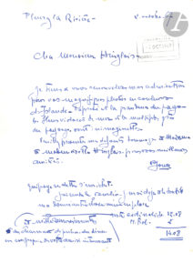 Paul JOUVE (1878-1973). 5 L.A.S, Paris et Fleury-la-Rivière août-octobre1967, à M. Hinglais, pharmacien à Épernay ;7 pages in-4 et in-8, une enveloppe. Il demande des médicaments pour ses crises de névralgie faciale. ; il remercie la famille...