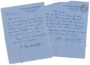 Fantômes complètement terminés "... - 9 juin 1923, il aimerait lui parler de ses Fantômes. - [27.XII.1926]. L'enterrement d'un " ami très cher " l'oblige à remettre leur rencontre. On joint une L.S. à un candidat à l'Institut (21 novembre 1934), et une carte de visite autogr.