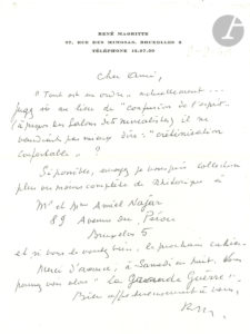 René MAGRITTE. L.A.S. " RM ", Bruxelles [9.IX.1964], à André Bosmans ; 1 page in-8 à son en-tête, enveloppe. À propos d'une mise au point dans la revue Rhétorique sur l'affaire des fausses Cartes d'après nature (éditées par le groupe de la...