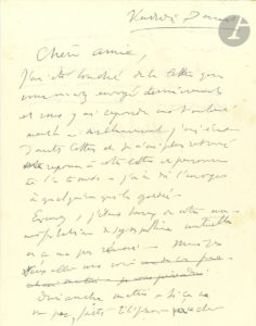 amis, j'irai vous voir un de ces matins. Votre carte de Pâques m'a beaucoup touché ! Restez en bonne santé ! "... Vendredi 3 mai. Il a répondu à la touchante lettre de sa chère amie instantanément, mais l'a ensuite égarée : " Excusez, j'étais heureux de votre manifestation de sympathie mutuelle et ça ne m'a pas réussi ". Il compte aller la voir dimanche matin, et la prie de saluer Henri...