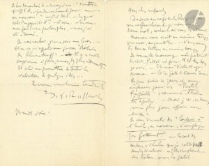 ils sont en voyage de noces en Italie ; le père se réjouit du bonheur de sa fille, même si elle lui manque et si la maison lui semble vide. Il leur écrit des lettres affectueuses, raconte la vie quotidienne et mondaine, déjeuners, dîners, sorties : " Demain nous recevons la veuve de Johann Strauss, le grand compositeur viennois. - Mardi Montesquiou nous a invités à un petit goûter intime au Pavillon des Muses. - Mercredi noces d'argent des Marc " ; il donne des nouvelles des amis : " les Barrès sont à Hyères " ; il envoie à Félix un extrait de catalogue où figure un ouvrage de M. de Beauchesne sur Madame Élisabeth. Il parle de son travail : " J'ai travaillé dans ma voiture ce matin à mon tableau de la "Porte St Denis" - un tableau important que vous n'avez pas encore vu. [...] Mon Victor Hugo commence enfin à marcher !... Le portrait est fini. Il n'est pas trop mal. ". " Je travaille beaucoup. - Le portrait de Mlle Gallot est fini. Il est très bien je crois. - Et mon "Victor Hugo" avance. - Et la Porte St Denis aussi"...Il va recevoir une bobine de Ruhmkorff (générateur électrique) : " Il y a mille expériences à faire avec, des plus étonnantes. Et cela me permettra de tenter la réalisation de quelques idées "... Il a reçu un " stéréoscope avec une dizaine de vues représentant ... votre mariage sortant de l'église !!! C'est absolument délicieux. Il faut voir Germaine, réservée, discrète, gentille, un peu effarouchée au bras de Félix, absolument vainqueur ! "... Mais la grande affaire est son invention des " "couleurs à l'huile, en morceaux à employer par frottement". Ce sont des couleurs à l'huile que je solidifie sans les dénaturer. Elles s'emploient en bâtons, comme les pastels [...] Le résultat est merveilleux. Les bâtons sont solides et cependant doux à employer. Je compte que cela va bouleverser l'art moderne. Car l'art est étroitement uni aux moyens d'expression existants. Je prends en ce moment des brevets dans le monde entier ". Il va les proposer à Lefranc, qui fabrique déjà le " Pastel Raffaëlli ". Il s'inquiète de ne pas avoir de réponse pour sa demande de brevet en Allemagne : " Il y a de quoi car j'ai la certitude d'avoir là une grosse, grosse affaire en mains ! "... On joint 13 l.a.s. de sa femme Rosine (une avec un post-scriptum du peintre), aux mêmes pendant leur voyage de nocs en Italie, où elle les suit par la pensée ; plus une lettre à elle adressée au sujet du mariage de sa fille ; et le manuscrit d'une étude de Florence Heywood sur Raffaëlli (8 p. et demie in-4).