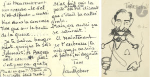 dédicace d'ami égaré par l'amitié m'a fait rougir... heureusement, tu me donnes en même temps la preuve par 69 de ma pauvre misère spirituelle. Si j'étais des dix O ! Goncourt - ça se saurait ! et je serais dans les tranchées du livre au lieu de rester à l'arrière comme un embusqué - pendant que tu montes fièrement à l'assaut aussi audacieusement que le dollar triomphant. Ma dernière érection je me la dédie - Au zéro inconnu !! J'ai heureusement une excuse - le sel m'est défendu - aussi bien dans la conversation que sur le bout de la queue "... - Après la première de Lohengrin : " Quand on a de l'argent on est intelligent - quand on n'a pas d'argent on est intransigeant. [...] J'ai vu ton portrait à la Biche - ce soviet à trois est terrifiant ! Vous avez l'air de bouffer les enfants de Thyeste - et comme toujours, je te regarde manger, et moi, je prends la ceinture. Merrrdre !!! ".. - " Comme il n'y a plus que les Juifs qui soient chez eux dans nos églises on peut prévoir que bientôt ils s'empareront du trou du culte comme si c'était celui de Léon Blum "... Etc. On joint 7 feuillets de dessins et caricatures (plume ou crayon) : Oscar Wilde, Adolphe Retté, docteur Festus, " Tarierikoff ", cochons...