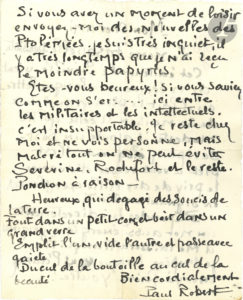 vous avoir. Il n'est pas dégoûté. Le pôvre vient d'éditer le livre ridicule du Môme "la Jaunisse" sur Napoléon. Hier, chez Charpentier, nous nous sommes tous foutus de lui. Il voudrait bien prendre sa revanche avec vous. La petite Forain a fait une pantomime exquise. Claude A.D. [Debussy] ravi, en fait la musique "... - [9 février 1898] (Louÿs est au Caire). Propositions insistantes du " môme Fasquelle "... " Si vous avez un moment de loisir envoyez-moi des nouvelles des Ptolémées. Je suis très inquiet, il y a très longtemps que je n'ai reçu le moindre papyrus ". Amusant quatrain libre de Ponchon... - Il voudrait lui présenter le sculpteur Desbois, qui " professe pour l'auteur des Chansons de Bilitis un culte qui me le rend très sympathique " ; nouvelles de Forain... - [1918]. Il a lu La Jeune Parque de Paul Valéry : " c'est très beau. Est-il possible de lire d'autres vers de votre ami ? "... - [5 mai 1919] : " Ponchon est très touché de vos éloges, et il est confus, car il ne les mérite pas "... Etc. On joint une L.A.S. de Pierre Louÿs à Paul Robert, 11 septembre [1917 ?] ; devenant aveugle, il cherche désespérément un secrétaire. Avec 3 enveloppes de Louÿs à Robert.