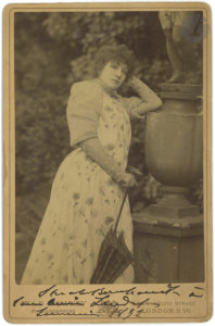 tenant une ombrelle. Dédicace : " Sarah Bernhardt à son ami Laudet Souvenir 1892 ".