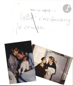 Gérard Bottino avec au dos une dédicace du photographe à Gainsbourg. On joint un document dactylographié (page in-4) pour une publicité sur les Gitanes blondes avec des corrections manuscrites ; 4 photos couleurs par le photographe Angeli, de Gainsbourg et sa compagne Bambou à la naissance de leur fils Lucien (janvier 1986) ; et 7 diapositives du même sujet ; ainsi qu'une enveloppe à en-tête de la NRF à l'adresse de Gainsbourg rue de Verneuil.