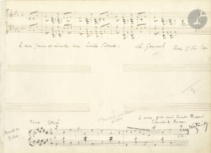Émile Pessard Ch. Gounod Rome 15 fév. /69 ". Au-dessous, 5 mesures d'une valse pour piano par Eugène Wintzweiller ; et au verso, 13 mesures pour piano " Final de la 1ère Sonate ", Allegro, par Alfred Rabuteau. On joint 3 L.A.S. de Gounod : 27 mai 1886, à l'abbé Mangot, curé de Montrichard ; 15 décembre 1888, à Paul-André Franchomme ; à son ami Cabarrus.