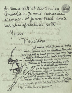 étaient fort excitants ". Carré ne l'a pas encore engagée mais elle a signé avec Bannel directeur des Folies : " Pourriez-vous être tout plein gentil et mettre quelques lignes à la rubrique de Music-Hall et Caf'Conc' au seul Comœdia ? " Elle lui envoie ses meilleurs vœux pour l'année 1914 : " réussites de toutes sortes, traités avantageux, multiples compte courants [...] et érections rigides sur les chaussettes des mineures que tu souilles abominablement "... Dessin d'une danseuse courant... - Elle annonce à " Mon délicieux Curn " que " je viens de faire une tournée triomphale [...] où je bouffais mal, et dormais plus mal encore, mais où les "pezetas" nécessaires à la vie d'une actrice en vogue tombaient dans la caisse [...] miracle "... Elle veut " faire un Arsène Lupin femme. [...] On pourrait faire ça mi-ciné, mi-pièce [...]. Alors j'ai pensé que Curnonski serait l'homme rêvé pour faire cette pièce - qui pourrait s'appeler Arsenette Lupinette et où l'on verrait une jeune femme sur la piste d'un crime [...]. Tourneuse d'obus ou policière la femme triomphe comme en amour - intrigue amoureuse indispensable pour les sous-entendus de Cur "... - Invitation à dîner avec Pierre Labrouche, avec dessin d'une petite fille de dos, ses livres posés à terre... - " Ô gentil Curn, merci à quatre pattes. J'attends un mot de Serge Basset, avec qui j'ai presque traité "... - Carte postale (Casino de Paramé), à un amant, s'inquiétant de savoir si c'est Curnonsky qui " fait courir le bruit que je suis la maitresse de René Peter - Il a tord [...] et toi bien davantage d'ajouter foi à des bruits aussi ridicules - attendu que tu sais combien je tiens [...] à ma virginité "... On joint une lettre d'un Antoine évoquant Musidora et la vente d'une collection sur le Music-Hall.