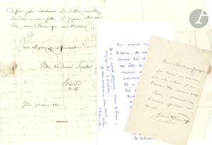 Louis Bourgault-Ducoudray, Alfred Bruneau, Gustave Charpentier, Maurice Chevalier, Michel Ciry, Charles Cuvillier, Alfred Dassier, Félicien David (2), Léonce Détroyat (2 à G. Hartmann), Louis Diémer (photo signée),les Frères Jacques, Jean Fournet, Pauline Gueymard, Eugène Guéjol, Reynaldo Hahn (à R. Peter), Meyriane Héglon, Lucienne Hérard, Ferdinand Hérold (plus un billet d'auteur à l'Opéra-comique, 1833, signé), Guy de Kervéguen, Marcel Landowski (2), Charles Lecocq (à R. O'Monroy), Paul Le Flem, Paolo Fratellini, Germaine Lubin, Henri Maréchal, Antoine Marmontel, Jules Massenet (3, et 2 cartes de visite), Giacomo Meyerbeer, Darius Milhaud, Pierre Monteux, Gabriel Montoya, Gustave Nadaud, Jules Pasdeloup, Francis Planté (2), Laurent de Rillé, Roland-Manuel (3), Guy Ropartz, Julien Rousseau, Frans Ruhlmann, Marcel Samuel-Rousseau, Henri Sauguet, Claude Terrasse, Ambroise Thomas, Théodore Valentin (et une vingtaine de lettres de femmes amoureuses), Maurice Verne (ms d'un article sur le music-hall), Pauline Viardot, Charles-Marie Widor. On joint 2 mss musicaux de chansons ; un carnet autographe de paroles de chansons (1818-1823, 132 p., dont un Éloge de Béranger) ; une affiche de l'Opéra de Paris (1958) ; des contrats pour des musiciens de cabarets et revues ; etc.