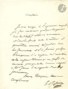 Gioacchino ROSSINI (1792-1868). L.S. ; 1 page in-4 ; en français. Il a apporté quelques changements au programme, " dans la classification des morceaux ". S'il y a encore quelque changement avant l'exécution, " cela ne peut tourner qu'au profit du...