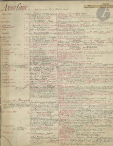 THÉÂTRE. Manuscrit, 1846-1890 ; 112 pages in-fol. aux encres noire et rouge (un feuillet déchiré). Curieux manuscrit d'un amateur de théâtre, répertoire de tous les spectacles qu'il a vus. Il se présente sur 3 colonnes : dans celle de gauche,...