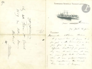d'Europe " en compagnie de de sa " jeune fille toute d'ambre clair " et de Catherine. " La vie à bord est un peu abrutissante mais dénouée d'angoisse, ce qui est déjà très joli. J'ai une jolie petite cabine pour moi tout seul. Je mange comme un tigre et flirte, sans conviction, avec de ridicules américaines jolies mais sans tendresse. C'est idiot. Heureusement qu'après demain, on sera à New-York, et le lendemain soir à Montréal. Mais tout ça ne vaut pas Winnipeg. Oh Winnipeg ! Je ne sais quel frisson de mystère me dit que c'est à Winnipeg la fin de mes détresses - Si c'était vrai, pourtant ? "... [Novembre 1894]. Il n'est pas allé la voir : " je ne fis que traverser la Babylone moderne. Je compte être de retour à Paris dans une dizaine de jours. Ma première démarche sera sûrement pour vous et pour tous les flachatic people. J'espère que vous êtes toujours bien portante et votre papa aussi et aussi les grands garçons, et les personnes de Bruxelles aussi et en particulier tout le monde de vos parents et de vos amis. Moi autrement, ça ne va pas pire, si ce n'est que je suis en proie à un accès de flemme à peu près irréductible (Depuis plus de deux mois, je n'ai pas touché une plume) "... [Honfleur 1895]. Sa femme Marguerite termine une lettre à sa mère : " Cette lettre aussitôt terminée, ma jeune compagne se fera un devoir doublé d'un réel plaisir, de vous donner de ses nouvelles, en s'excusant, toutefois, d'avoir mis un si longtemps à le faire. [...] il n'y a point là de sa faute, la pauvre enfant ayant eu, depuis son arrivée à Honfleur, ses loisirs à peu près complètement occupés. Marguerite, en petite personne très roublarde, a su se faire bien voir de tout le monde ici. Dans ma famille, on ne jure plus que par elle, et, moi, je suis devenu un être à peu près négligeable. C'est bien triste ! "... Puis Marguerite Allais prend la plume : " je nage dans la joie et l'admiration, la joie d'avoir un papa, une maman et une sœur - tous si gentils si affectueux pour moi, et gais aussi car on ne s'ennuie pas une minute "... Elle n'a pas beaucoup aimé Le Havre : " J'aime mieux les petits quais et rues d'Honfleur. Il n'y en a de jolies comme des bijoux "... On joint une L.A.S par Marguerite et Alphonse Allais à Pierre Stevens, 6 février 1895 (2 p. in-12, enveloppe).