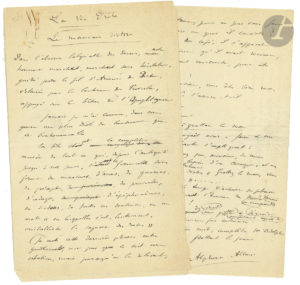 Alphonse ALLAIS. 2 manuscrits autographes signés, La Vie Drôle, [1900] ; 4 pages in-8 (au dos de circulaires du Crédit International, 17 janvier 1900) et 4 pages petit in-4 (lég. fentes au pli). Le mauvais dicton (publié dans Le Journal du 24...