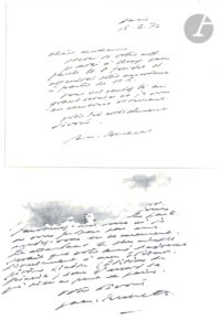 Samuel BECKETT (1906-1989). 3 L.A.S., 1972-1973, à Mme Vieuxtemps à La Ferté-sous-Jouarre ; 2 pages oblong in-12 (une avec lég. mouillure), et carte de visite, 2 enveloppes. Au sujet d'une visite à Ussy ; pour ses livres, s'adresser à son...