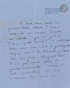 COLETTE (1873-1954). L.A.S., Immeuble Marignan [12.II.1936], à Mme Bloch-Laroque ; 1 page et quart petit in-4 sur papier bleu à son adresse, enveloppe. " C'était donc vous, ma grande belle chèvre ? Vous avez été un amour. Traitée en vedette,...