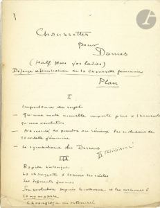CURNONSKY. 2 manuscrits autographes et 3 notes autographes, [vers 1905] ; 9 pages in-4 et 13 pages in-8. Autour de Chaussettes pour Dames, et la collaboration avec Willy. Plan de Chaussettes pour Dames (Half Hose for ladies) Défense et Illustration...