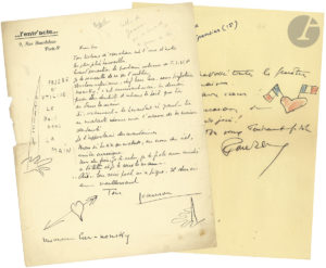 père Edmond Sailland (1880-1909, plus une réponse de Maurice) ; amis de jeunesse, un aumonier ; Gabriel Alphand, Androuet (maître fromager), Maurice d'Auberlieu, Paul Aubry, Vincent Auriol, Harry Baur, René Bazin, Térèse Blondel (6), Dominique Bonnaud, L. Boucher, Joseph Bourdel (de Plon, secours pour Willy en 1928), René Boylesve, Rodolphe Bringer, Dr Cabanès, Charles Carrington, Carlos de Castéra (3), J. Chasle Pavie, Romain Coolus, Georges Courteline, Édouard Deverin, Marcel Dorin (et les Rôtisseurs), Gabrielle Dorziat, Henri Duvernois, Paul Fort, Maurice Garçon, Roger Giron, Charles Gouzée, Jacques Hébertot (2), André Heymann (Le Cycle et la Revue des Sports), Ludovic Halévy, B. Hubert (5), Henri Jeanson (3, dont une avec dessins, plus faire-part de son mariage), Anatole Jakovsky, Dr Georges Laurens, Pierre H. de La Blanchetai (7), Pierre Labrouche, Léo Larguier (2), Jean Laumond (4), Gabriel de Lautrec, Marc Lefébure, Désiré Lemerre (3), Lugné-Poe, Maurice Magre, Maurice Martin du Gard, Henri Martineau, Henri Mathonnet de Saint-Georges, Georges Milton, Francis de Miomandre, Yves Mirande, Eugène Montfort, Albert Montreuil (au dos de son ex-libris), commandant Noton, Léon Ohnet, Polaire (réponse à une enquête), J. de Poutre (parlant de Colette Toby chien), René Préjelan, Xavier Privas, Paul Reboux (avec dessin), Henri de Régnier, Rip, Romi, Séverin-Mars, Valentin Tarault (4, une en vers), André Tardieu, Marcelle Tinayre, Alfred Vallette, Pierre Varenne, Pierre Veber, José Vidal, Maurice Yvain, etc. On joint des lettres et papiers de famille ; son acte de baptême ; et divers documents (carte d'étudiant, reçus, factures, sommation d'huissier, quittance de loyer, candidateur (en partie autogr.) à la Société des Gens de Lettres, prospectus de l'Académie des Gastronomes, etc.).