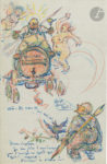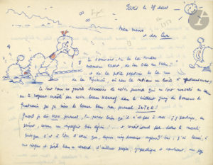 illustrées, caniches et veau), Fabien Fabiano (illustrée, femme nue), Louis Fortuney (11, dont 10 illustrées, plume et crayons de couleur, sur le thème gastronomique), Joseph Hémard, Job (1921, avec dessin aquarellé : femme nue au bord de la mer), Jean Lachaud (2, au sujet du jeu de jacquet, avec 2 dessins), Charles Léandre, Paul-François Morvan (15, dont 12 illustrées, plume et crayons de couleur ; plus 6 ex-libris érotiques), Georges Saulo (projet de buste de Cur pour Angers), Louis Touchagues, " le Vidame " Robert West (2 avec dessins), etc. On joint un dessin au crayon par Maurice Asselin (portrait du Dr Tartarin Malachowski, 13,5 x 9 cm) ; et un dessin humoristique.