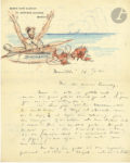 [CURNONSKY]. 42 L.A.S. la plupart illustrées, à lui adressées, par des peintres et dessinateurs, 1913-1955 et s.d. ; la plupart in-4. Amusant ensemble de lettres illustrées de dessins libertins ou gastronomiques. Joe Bridge (5 lettres...
