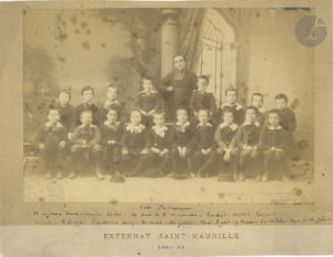 [CURNONSKY]. 21 photographies, 1881-1952 et s.d. : formats divers 2 photographies de groupe d'élèves de l'Externat Saint-Maurille d'Angers, autour de l'abbé Prudhomme, 1881-1882, une annotée par Curnonsky qui identifie les élèves, dont...