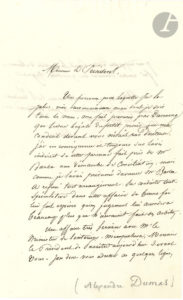 Alexandre DUMAS père (1802-1870). L.A.S., [juin ? 1834], à un président de tribunal ; 1 page et demie in-8. Au sujet de son procès contre l'éditeur Barba. " Une personne pour laquelle j'ai la plus vive reconnoissance, mais dont je dois taire le...