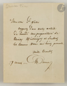 Alexandre DUMAS père. L.A.S., 27 mars [1865], à Paul de Saint-Victor au journal La Presse ; 1 page in-12, enveloppe a.s. (encadrée). Il le prie de rappeler " dans votre article de Lundi ma proposition de Théâtre Historique et soutenez la comme...