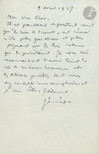 Félix FÉNÉON (1861-1944). L.A.S., 9 avril 1927, à Maurice Curnonsky ; 2/3 page in-8. " Il est paradoxal et pourtant exact que le Livre de chevet ait réussi à être plus gai encore et plus piquant que les trois volumes qui le précédaient. Je...
