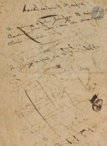 Victor HUGO. Manuscrit autographe avec dessins ; encre brune ; 1 page in-fol. (29 x 21,5 cm ; rousseurs ; encadrée). Brouillon pour Les Burgraves, drame créé à la Comédie-Française le 7 mars 1843. On y relève des notes :" hache énorme...